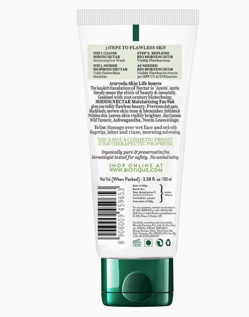Biotique Morning Nectar Moisturize & Nourish Face Wash | Contains Wild Turmeric, Neem Leaves, & Morning Nectar | Visibly Flawless Skin | Suitable for All Skin Types | 100 ml