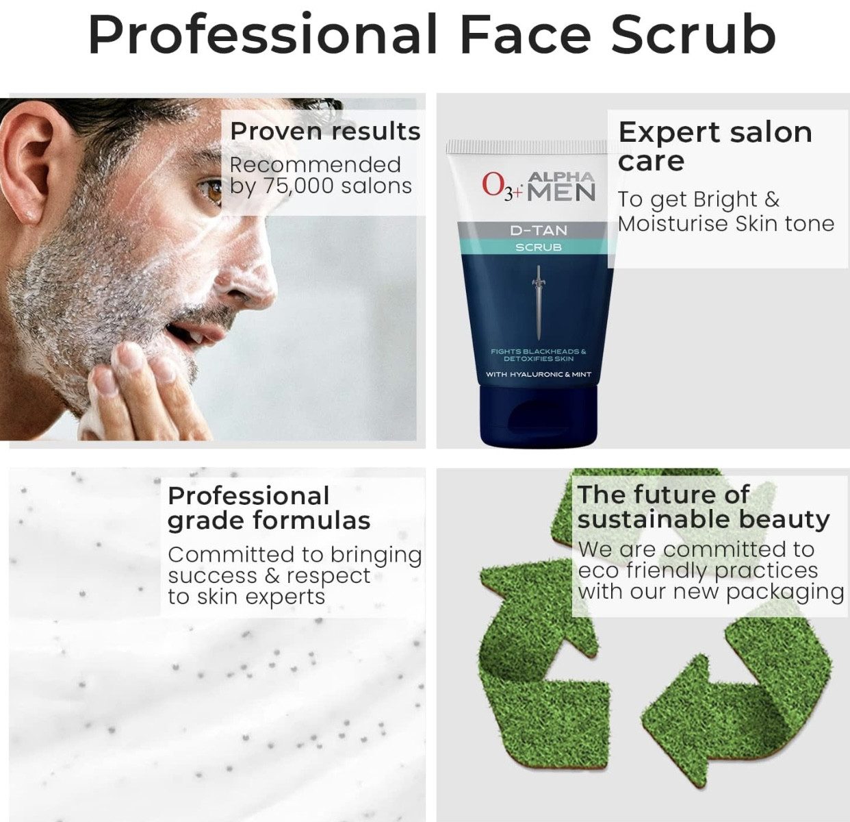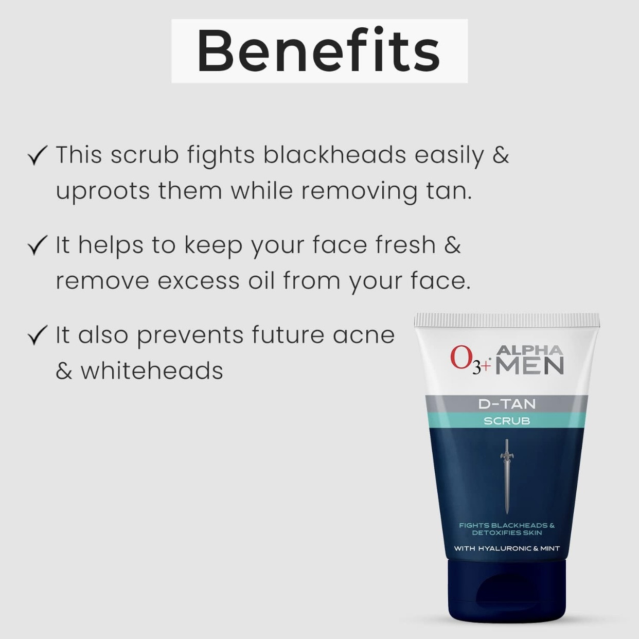 O3+ ALPHA MEN Acno D-TAN Scrub With Hyaluronic & Mint 50g - Detan Scrub for TAN removal | Fights Blackheads & Detoxifies Skin