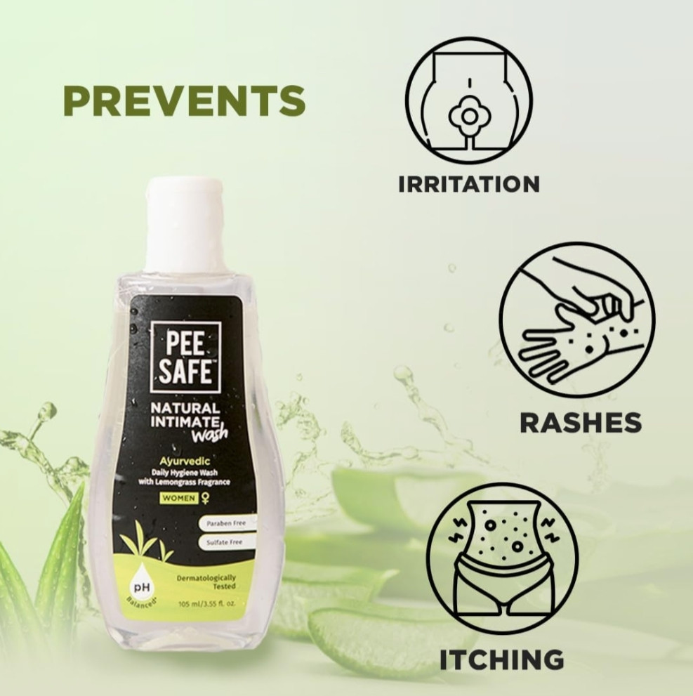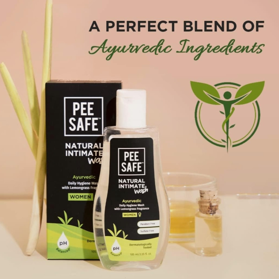 Pee Safe Intimate Wash For Women Natural Ayurvedic with Lemongrass Fragnance and 100% Alcohol-Free | pH Balanced | Paraben-Free | Sulfate-Free | 105ml