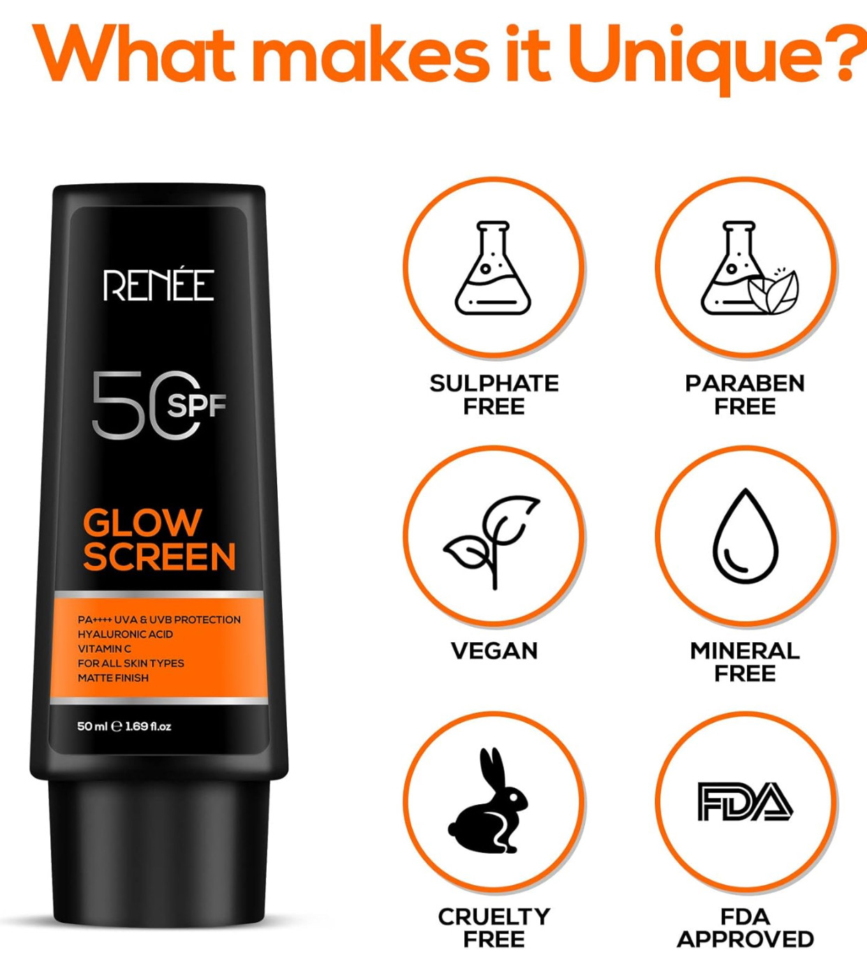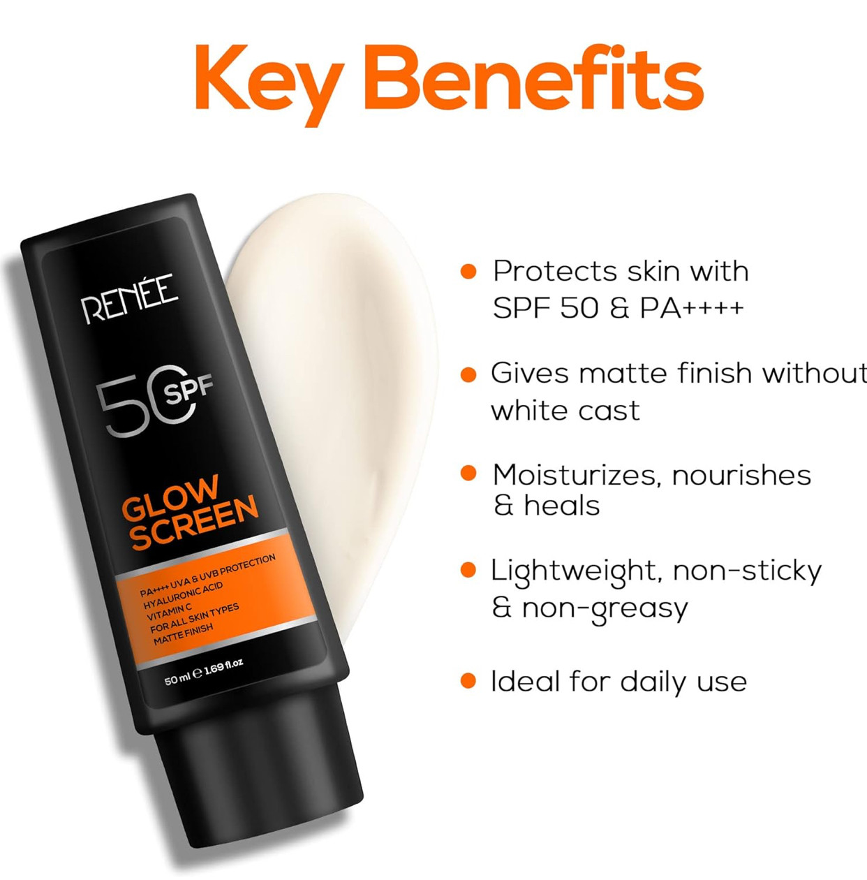 RENEE Glowscreen SPF 50 Sunscreen Cream - 50ml, PA++++ UVA & UVB Protection, Hyaluronic Acid & Vitamin C Enriched | Non-Greasy, Quick Absorbing Matte Formula, No White Cast - Ultimate Skin Protection