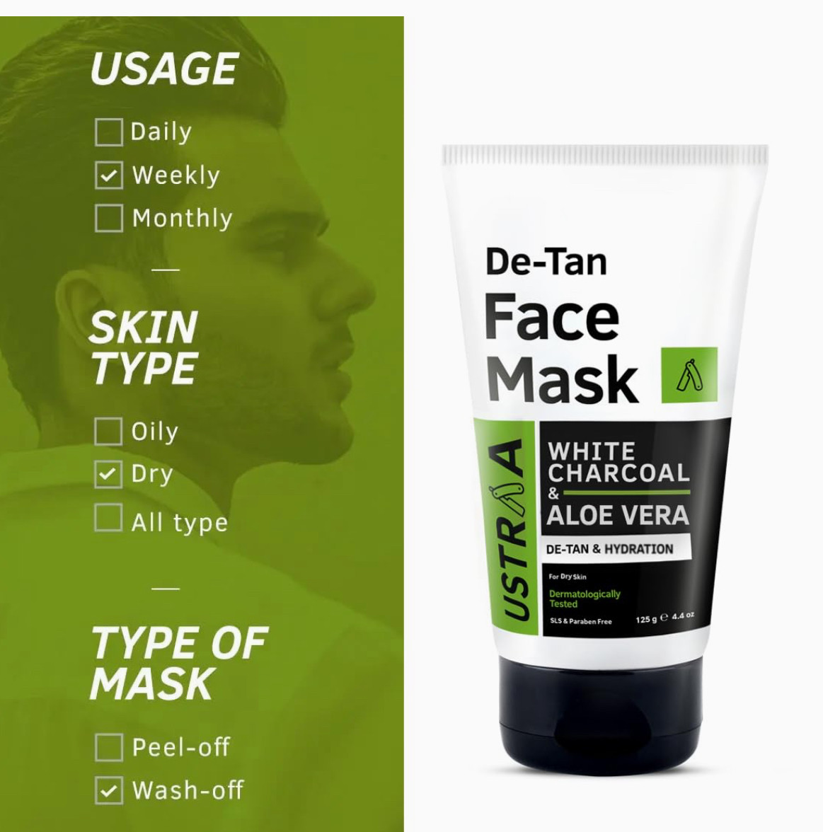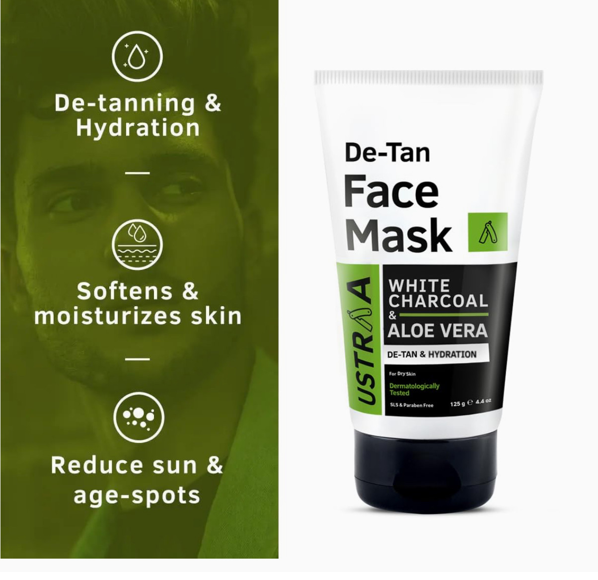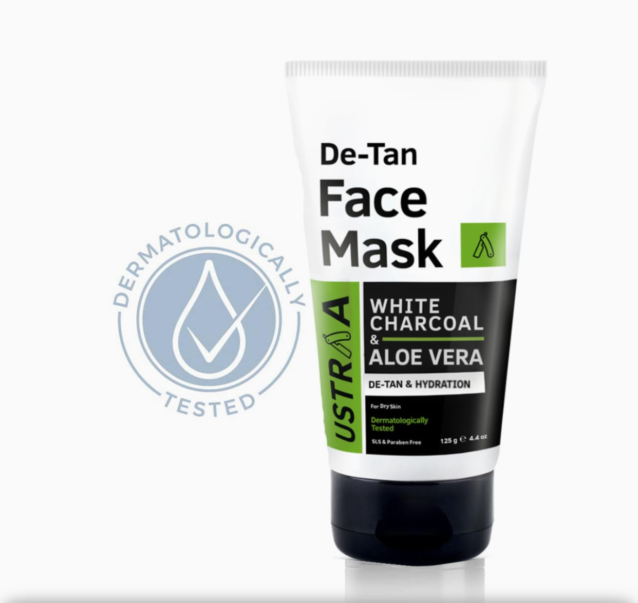 Ustraa De-Tan Face Mask - Dry Skin - 125 gm - Wash-off mask | Effective Tan Removal with White Charcoal | Removes Dead Skin & Pollutant | Anti-inflammatory properties of Aloe Vera
