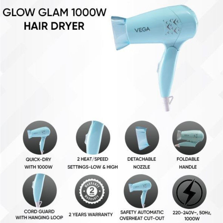 VEGA Glow Glam 1000W Hair Dryer- VHDH-26-Blue