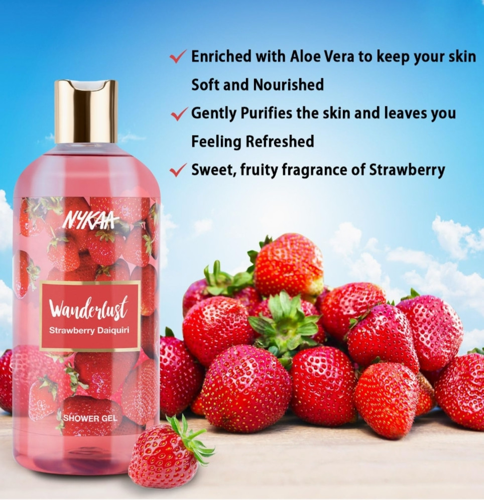 Wanderlust Strawberry Daiquiri Shower Gel, 300 ml| Nourishes & Hydrates| Gentle Cleanser| Sweet Smell of Strawberry |Enriched With Aloe Vera| Paraben-Free, Vegan Formula| Suitable for All Skin Types