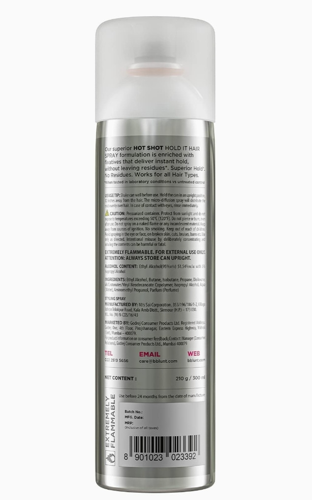 BBLUNT Hot Shot Hold Spray for Instant & Firm Hold, 300ml - Hair Setting Spray for Women & Men, No Residue, No Sulphate & No Alcohol