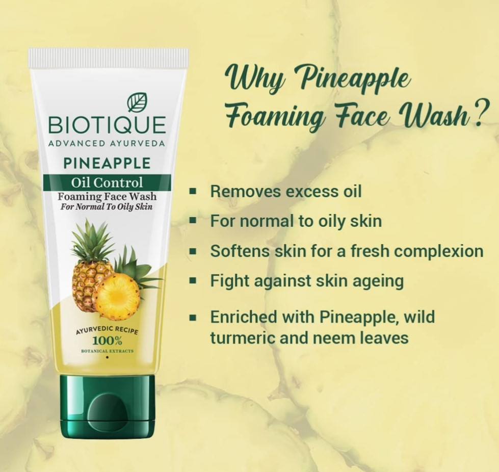 Biotique Pineapple Oil Control Foaming Face Wash | Hydrates dry skin | Eliminates Excess Oil | Evens Skin Tone | 100% Botanical Extracts | Suitable for All Skin Types | 100ml